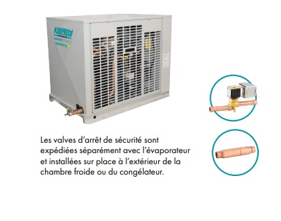 Cet appareil est doté d’un ou de deux compresseurs et d’un condenseur à rejet vertical refroidi à l’air. Il est approprié pour les chambres froides et armoires réfrigérées de grande taille, les congélateurs à air pulsé, les entrepôts et les espaces climatisés dans lesquels les condenseurs fixés au toit sont les plus pratiques.