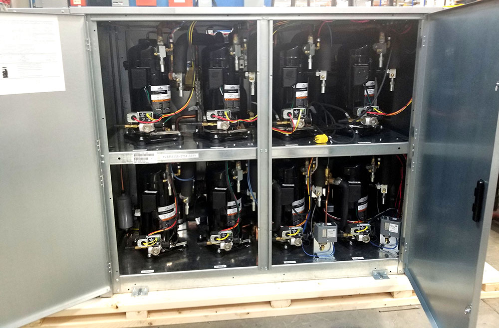 Our Parallel Compressor Systems consist of multiple compressors that work together to satisfy large refrigeration loads. Instead of using one very large compressor, multiple smaller compressors are piped in parallel to provide the same capacity as the large compressor while providing flexible capacity control that a large compressor can’t provide.