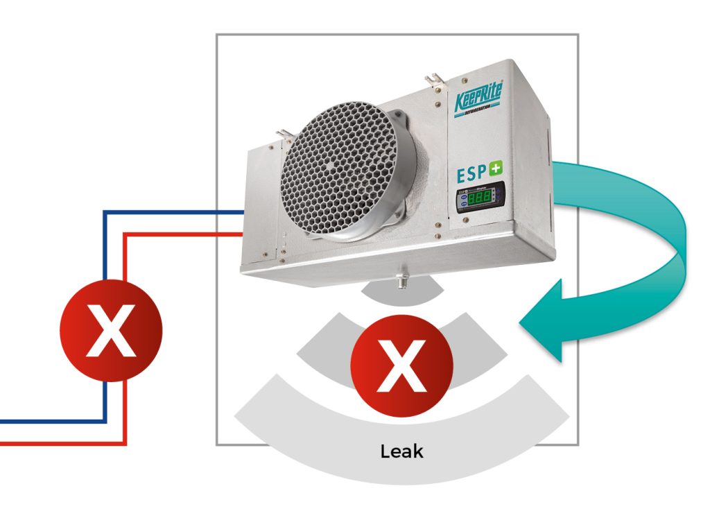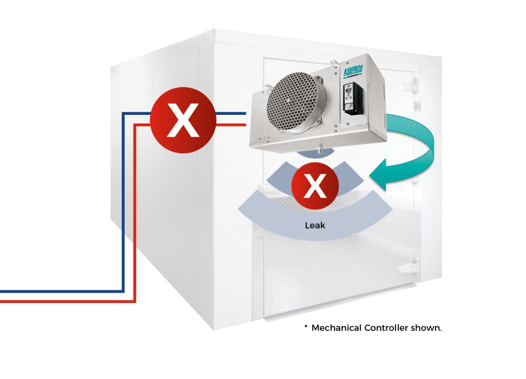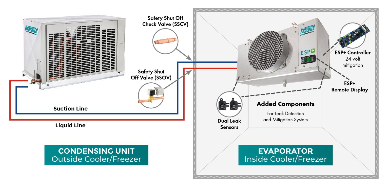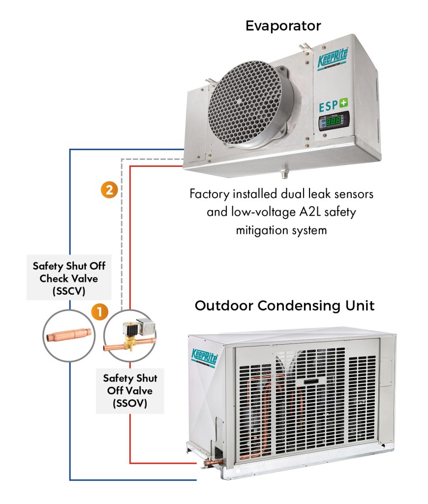 When a sensor detects a refrigerant leak, the safety shut-off valves will isolate the evaporator to limit the releasable charge leaked and keep the evaporator fans running to circulate the air and dissipate the gas.