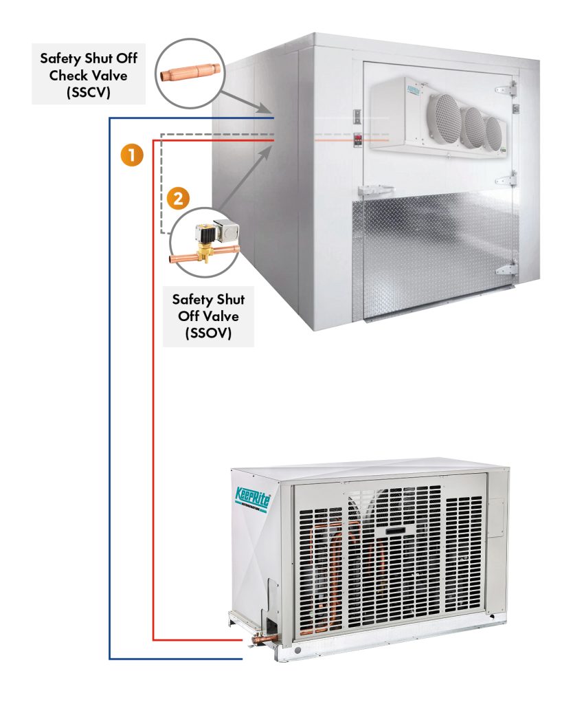 1. Install two safety shut-off valves on the line set outside of the walk-in cooler/freezer.